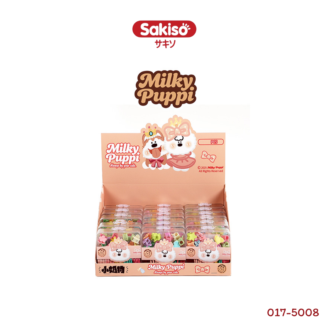 ชุดกิ๊บหนีบผมและยางรัดผมดีไซน์สุดพรีเมียมจากคอลเลกชัน Milky Puppi มาในตลับพลาสติกใสทรงสี่เหลี่ยมจตุรัสที่แบ่งช่องจัดเก็บอย่างเป็นระเบียบ ตัวกล่องตกแต่งด้วยภาพน้องหมาสวมมงกุฎและโบว์สุดน่ารัก บรรจุเครื่องประดับโทนสีพาสเทลที่สดใสและหลากหลาย เหมาะสำหรับเด็กๆ ที่ต้องการเปลี่ยนลุคให้ดูน่ารักในทุกวัน