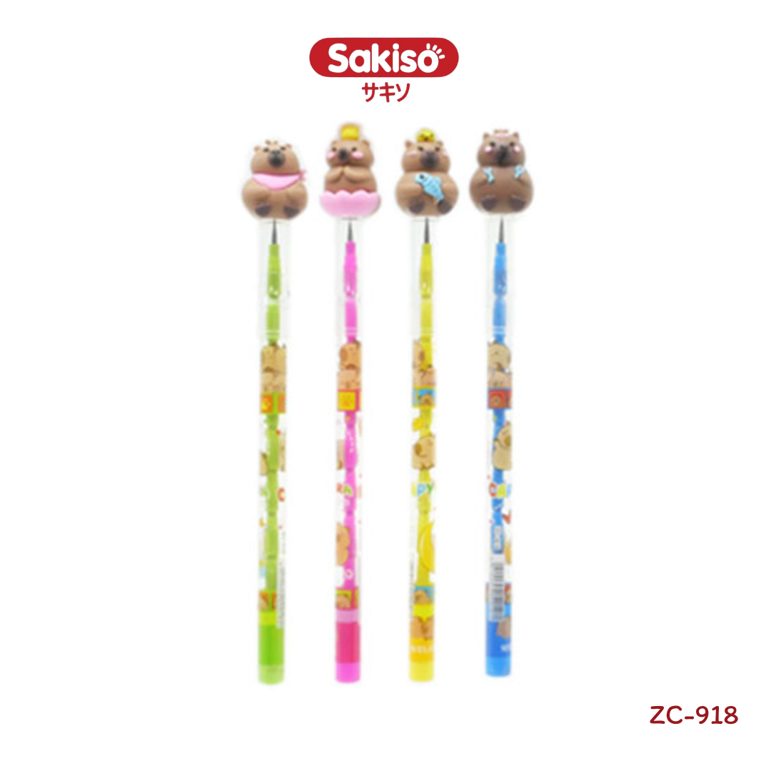 ตัวด้ามพิมพ์ลายเต็มแท่ง: ด้ามดินสอเป็นพลาสติกใส พิมพ์ลวดลายคาปิบาร่าแบบกราฟิกสวยงาม สีสันสดใสแมทช์กับตัวแท่ง